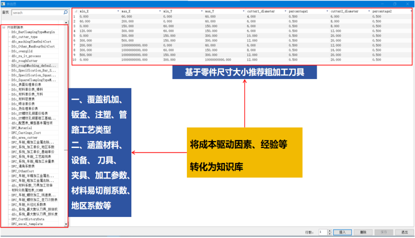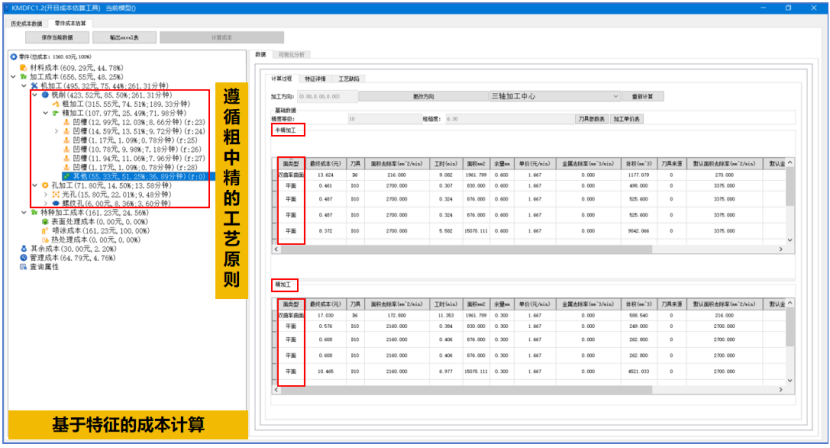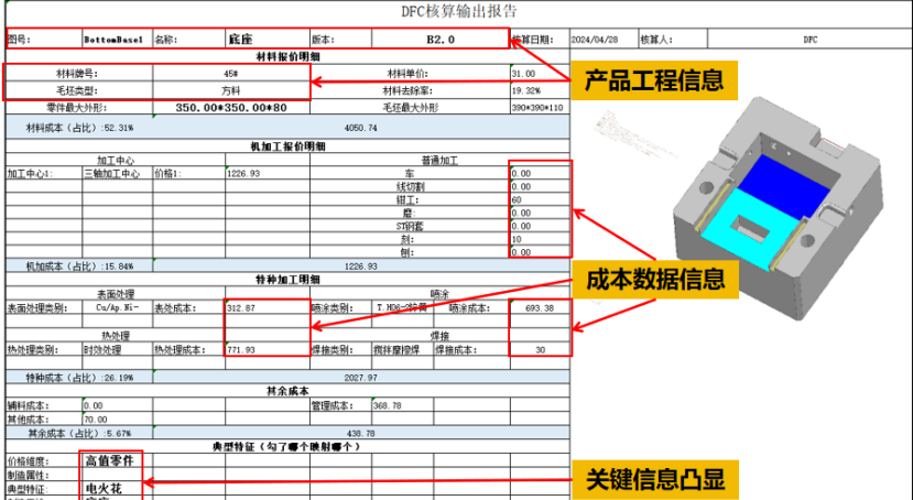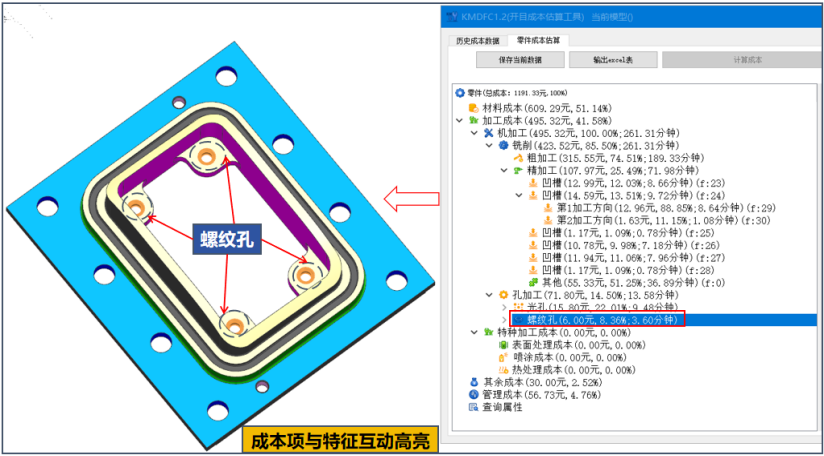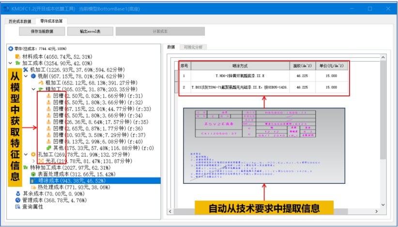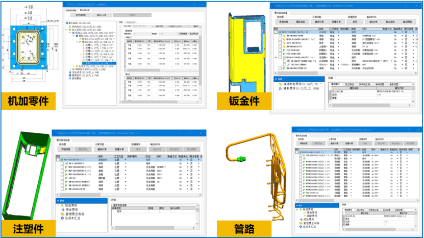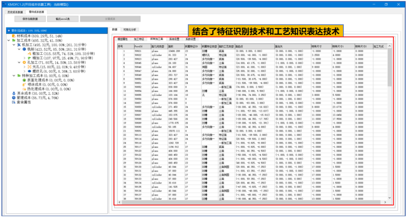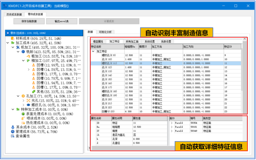 开目3DDFC 是一款基于 MBD 模型和工艺知识库的专业三维制造成本分析与估算软件,在不依赖详细工艺路线的情况下,根据零件几何信息和精度信息一键式完成成本估算。该软件充分融入“并行工程”的关键思想,并基于开目的三维设计模型特征识别技术,以及零件加工成本计算模型,能快速获得相对准确的加工成本。为面向成本的设计优化提供参考指引,也为企业对外产品报价或产品外协件采购价格提供量化依据,实现降本增效。