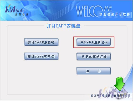 运行开目CAPP 安装盘中的KmcappSetup.exe文件,在弹出的安装界面中,点击“MSXML解析器3”按钮安装即可。