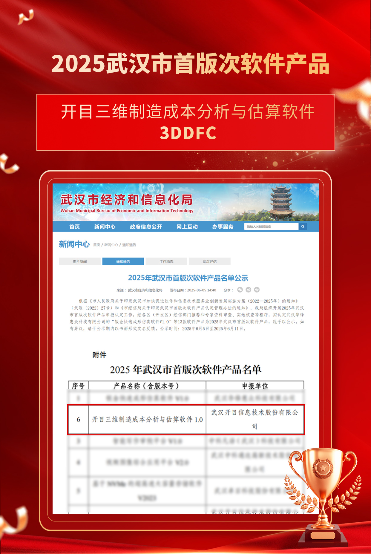 近日,2025年武汉市首版次软件产品名单正式公布,经武汉市经济和信息化局严格评审,开目软件自主研发的“三维制造成本分析与估算软件3DDFC”凭借领先的技术实力、成熟的市场落地与完善的自主知识产权体系,成功入选。