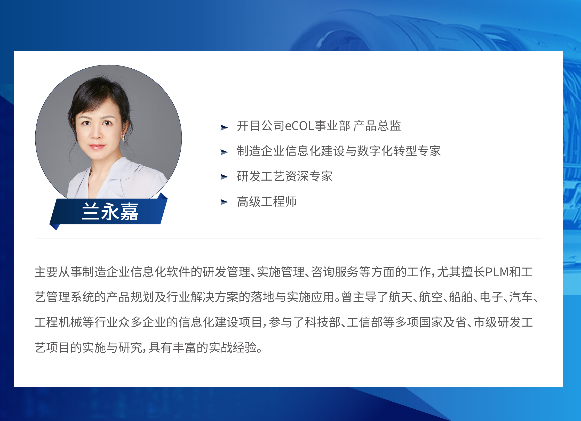 本期研讨会特邀开目公司eCOL事业部产品总监兰永嘉女士、东风德纳车桥有限公司制造信息化专家赵中军先生、高德红外工艺信息化专家施群先生做客开目线上直播间,专家将全程在线答疑,与来宾深入探讨开目“研发工艺协同”的优势特点与实际落地应用。