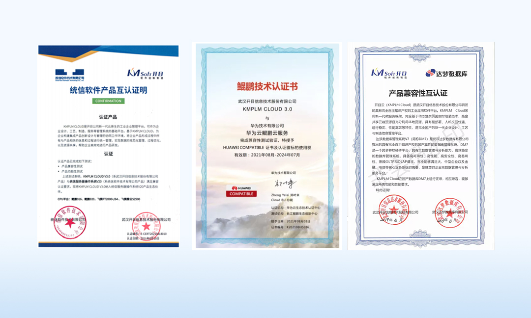作为民族工业软件的杰出代表,开目不断进行技术预研以及跨平台功能改造,2021年,自主研发的eCOL PLM、KMPLM CLOUD平台打通了与银河麒麟、统信、深度等国产操作系统,以及鲲鹏、飞腾、兆芯等国产CPU硬件、达梦数据库等主流的国产软硬件平台兼容,充分实现了KM PLM系统的完全自主国产化,并获得与华为云鲲鹏云服务、统信操作系统、达梦数据库兼容认证证书。