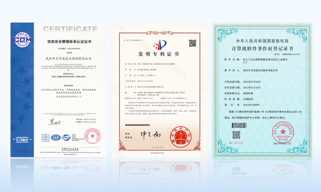 2021年,开目秉持匠心,自主可控创新研发之路再上新台阶。2021年荣获4项发明专利授权,以及27项软件著作权。截止到目前,开目公司发明专利及软件著作权超过200+。此外,今年,开目公司顺利通过ISO27001信息安全管理体系认证,获得全球信息安全的权威认可。