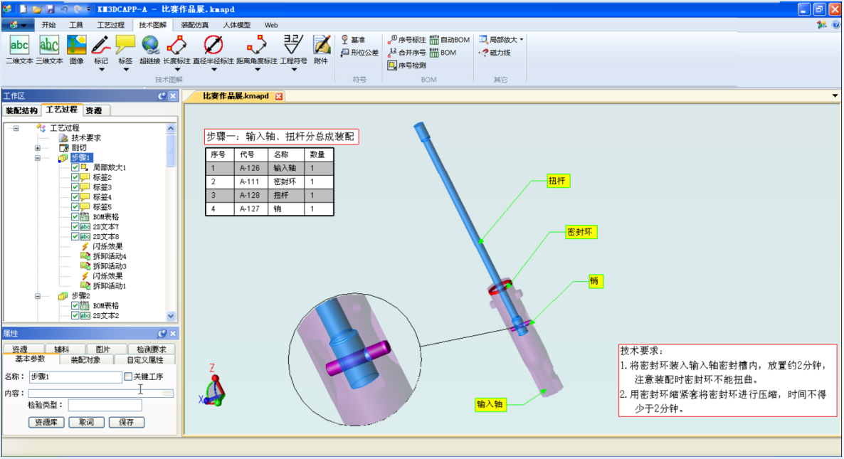 通过详细工序设计功能??椋芄还婊芭涞拿恳坏雷芭涔ば蚧蚣觳夤ば?,指定每一道工序装配的零部件清单,定义工序的各个工步。在拆卸产品的过程中,可以使用如扳手、螺丝刀等工艺装备,并定义使用工艺装备拆卸产品零部件的详细细节。通过技术图解,用户可以指定工序的工序名称、内容,通过自定义属性定义装配的各种信息,包括装配方法、注意事项、检验方法等等,产生完善的装配数据信息。
