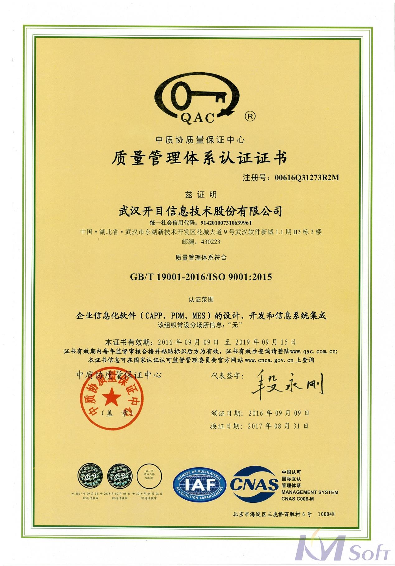 开目公司作为中国最大、实力最强的离散制造企业智能工艺创新平台软件产品研发及方案提供公司,将管理体系建设作为公司发展过程中常抓不懈的一项重要工作,此次顺利通过了ISO9001的认证审核,是对公司的一种肯定,表明公司能持续稳定地向顾客提供预期和满意的合格产品。