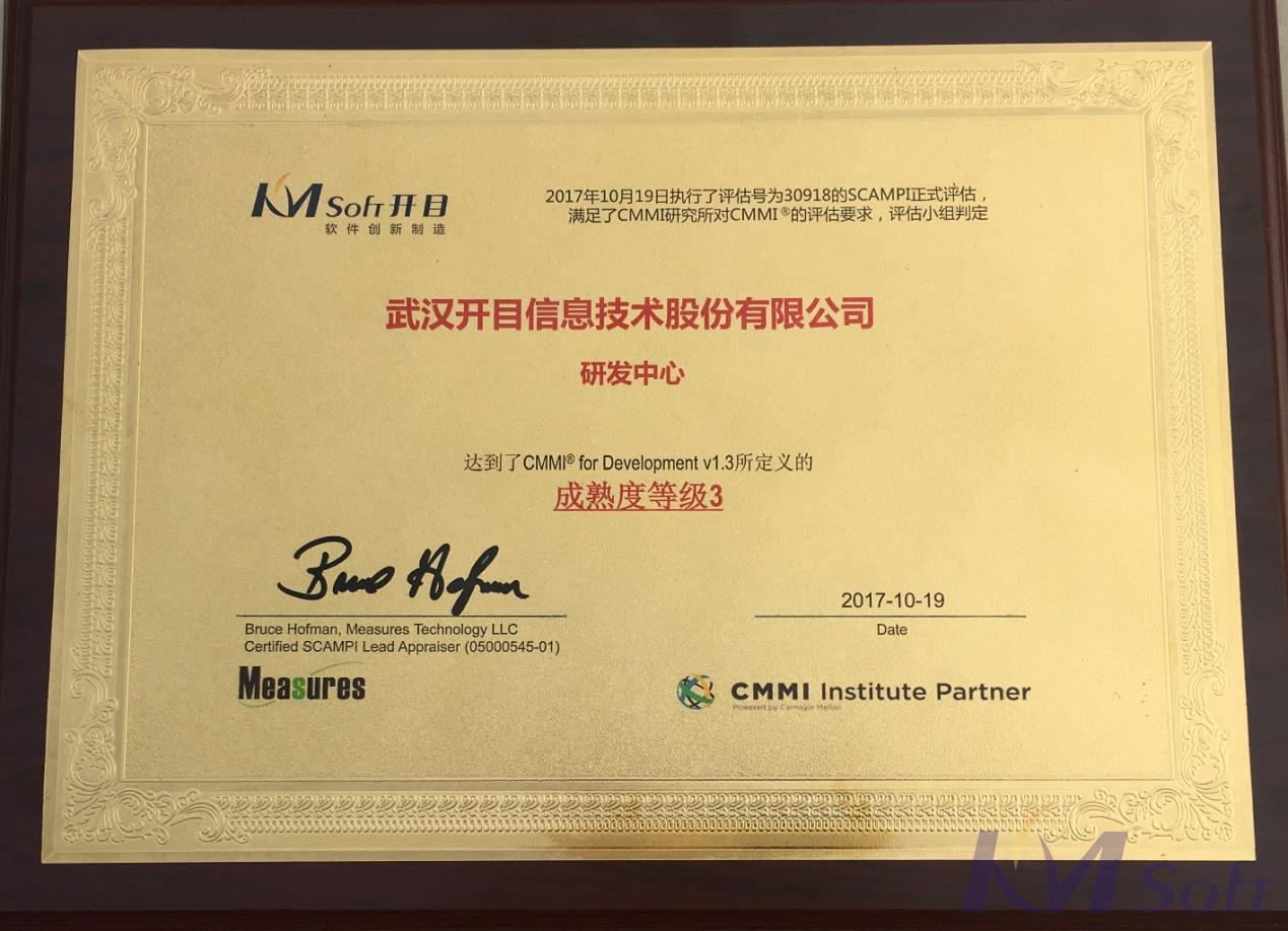 开目公司凭借着强大的创新实力和品牌优势,成功获得包括湖北省认定企业技术中心、软件成熟度模型CMMI3级、质量管理体系等多项重要资质认证。