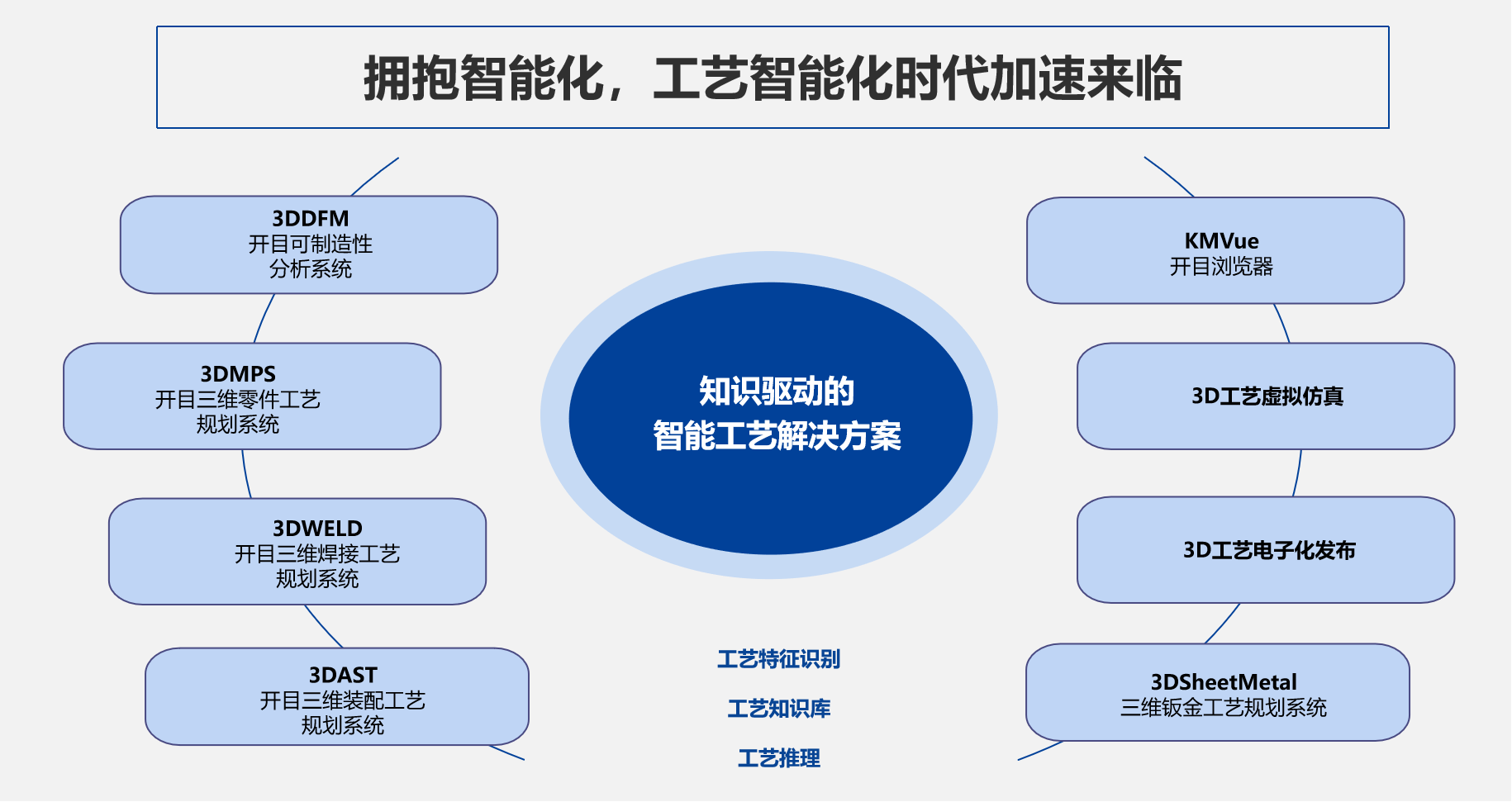 开目软件自主研发的知识驱动的三维智能工艺设计与仿真解决方案,旨在利用 MBD 技术、智能推导、虚拟仿真等数字化技术,以知识与三维模型驱动,特征识别技术和专家知识库为核心,搭建数字化设计与智能制造的桥梁,并与开目管理系统集成,实现企业三维技术的全面贯通,助力高端制造业客户提质增效、降本减存,真替真代。