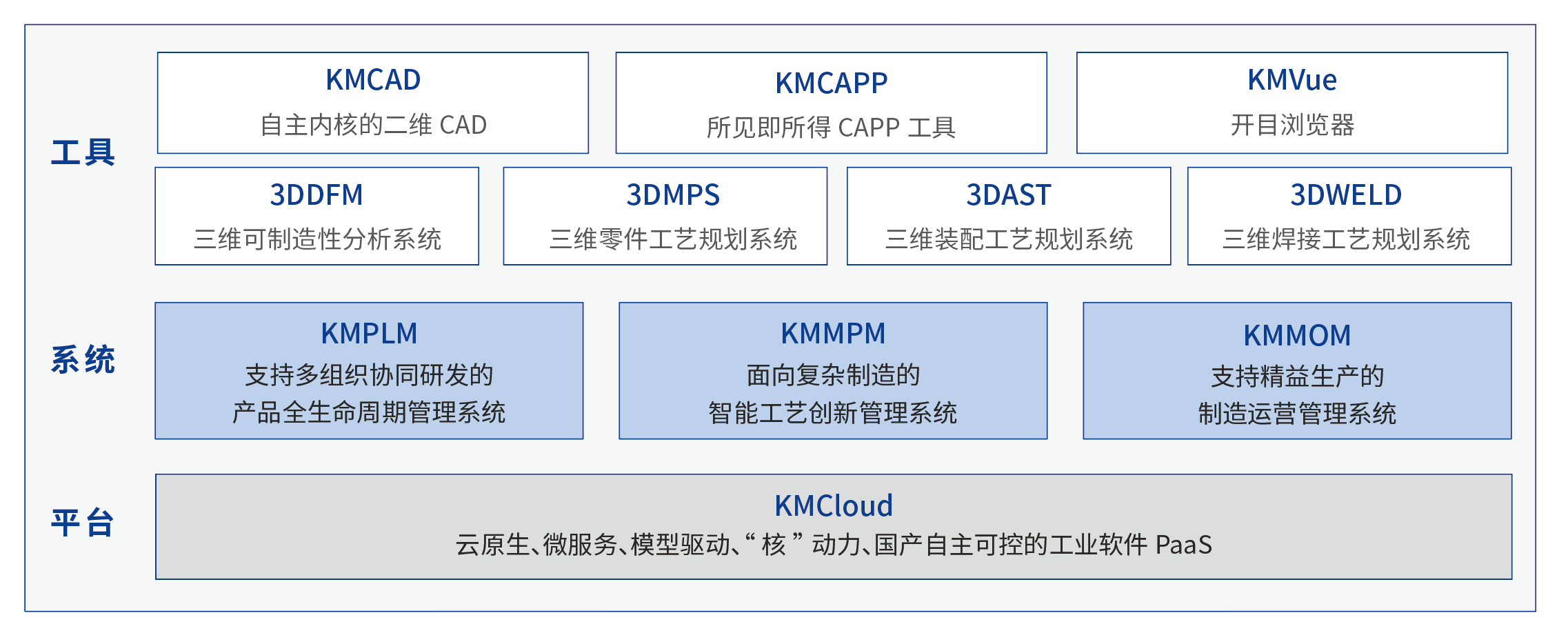 “1”即KMCloud 平台,是开目推出的基于云原生、微服务、模型驱动、“核”动力、国产自主可控的工业软件PaaS,支持多组织、多租户、跨地域高效协同,为企业构建数字化研发、数字化工艺、数字化制造等业务场景提供了坚实的底座;“3”即KMPLM、KMMPM、KMMOM三个管理系统;“X”即KMCAD、KMCAPP、KM3DDFM、KM3DAST、KM3DMPS、KM3DWELD、KMVue等一系列研发设计类工具软件。
