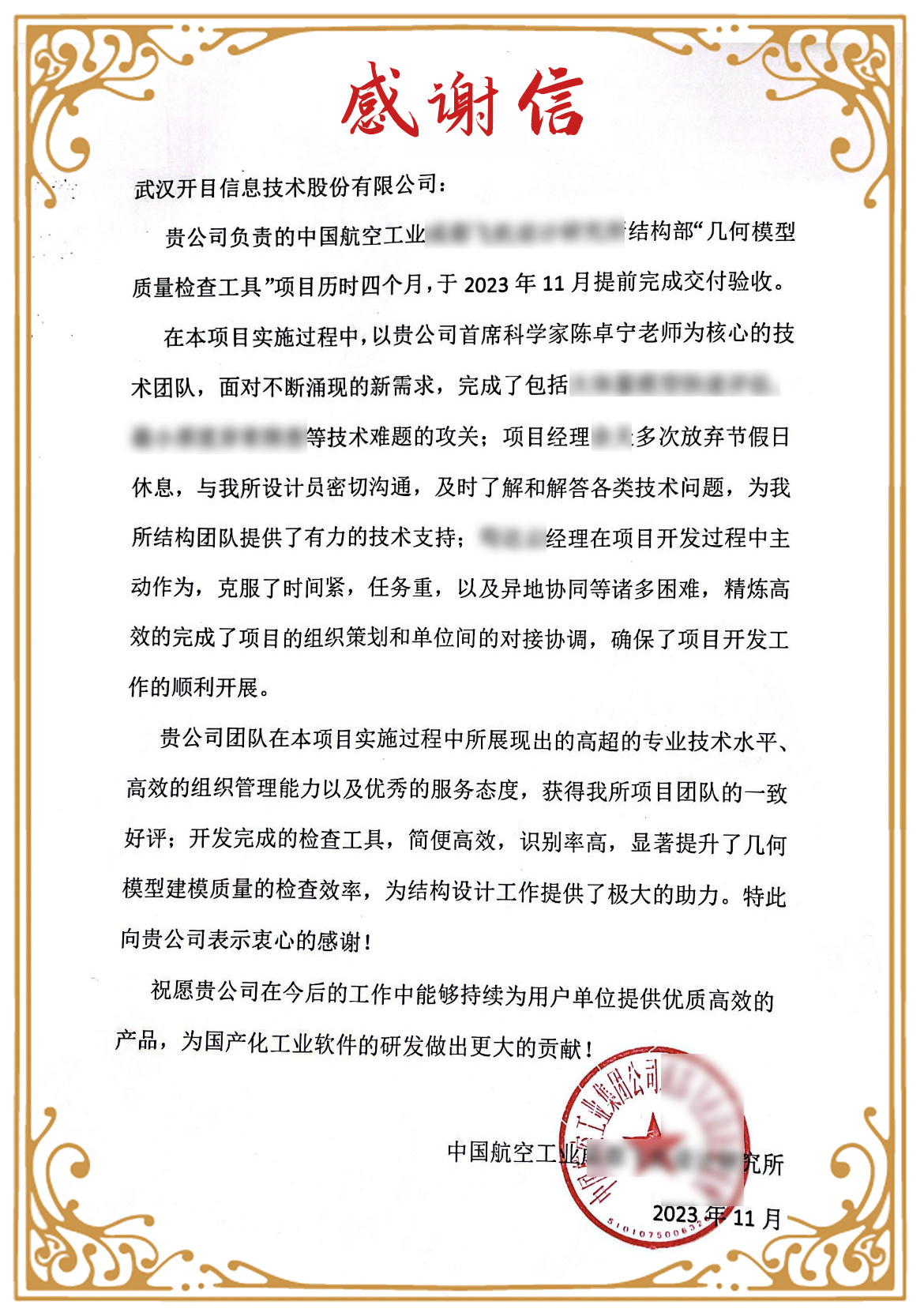 近日,中国航空工业集团某研究所几何模型质量检查工具(3DDFM)项目顺利验收,项目组仅用4个月便提前完成了大量艰难的个性化需求技术攻关,实现了批量自动化的几何模型质量审查。为此,该研究所向开目软件发来感谢信,对项目团队的敬业精神和专业技术实力,表达了衷心的感谢与夸赞。